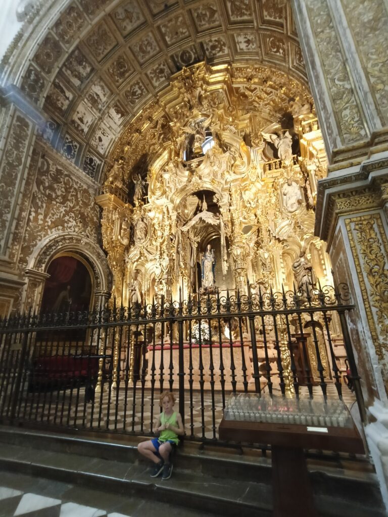 Even our children, who have seen their fair share of churches and temples, found Granada Cathedral fascinating. It is huge! The soaring ceilings, colourful stained glass, and all the gold and tapestries made it a hit. You enter in one side, and exit through the opposite wall and out to an area full of amazing restaurants, ice cream places and bars. These things come in very handy for bribery if the cathedral isn’t quite doing it for them.