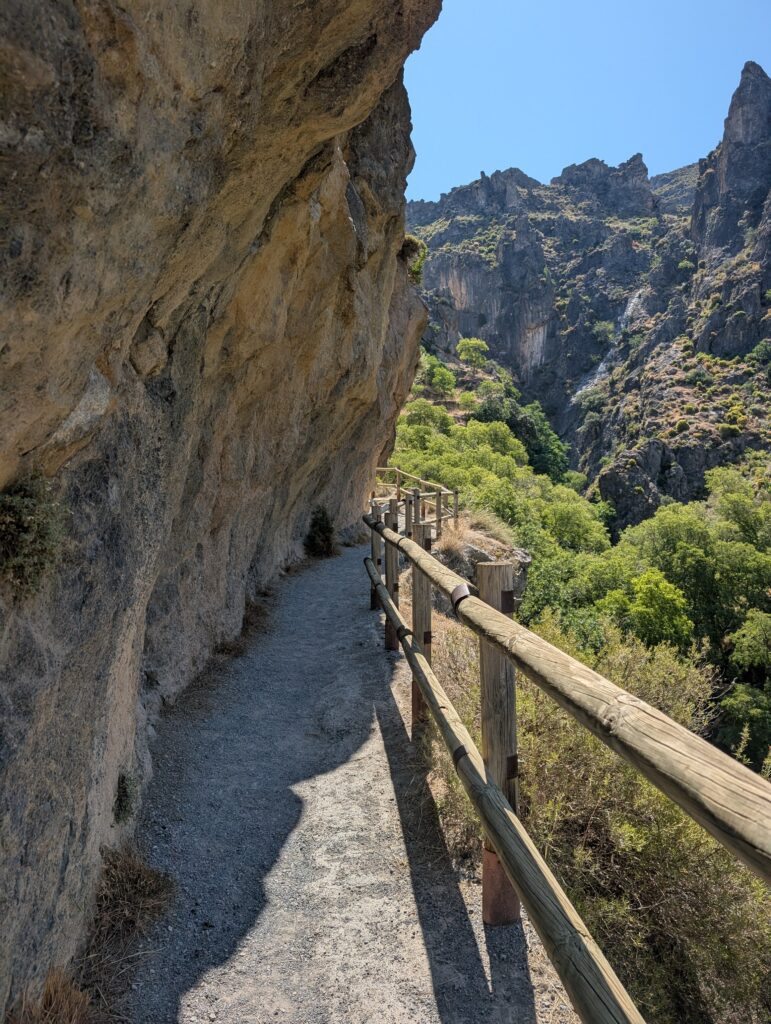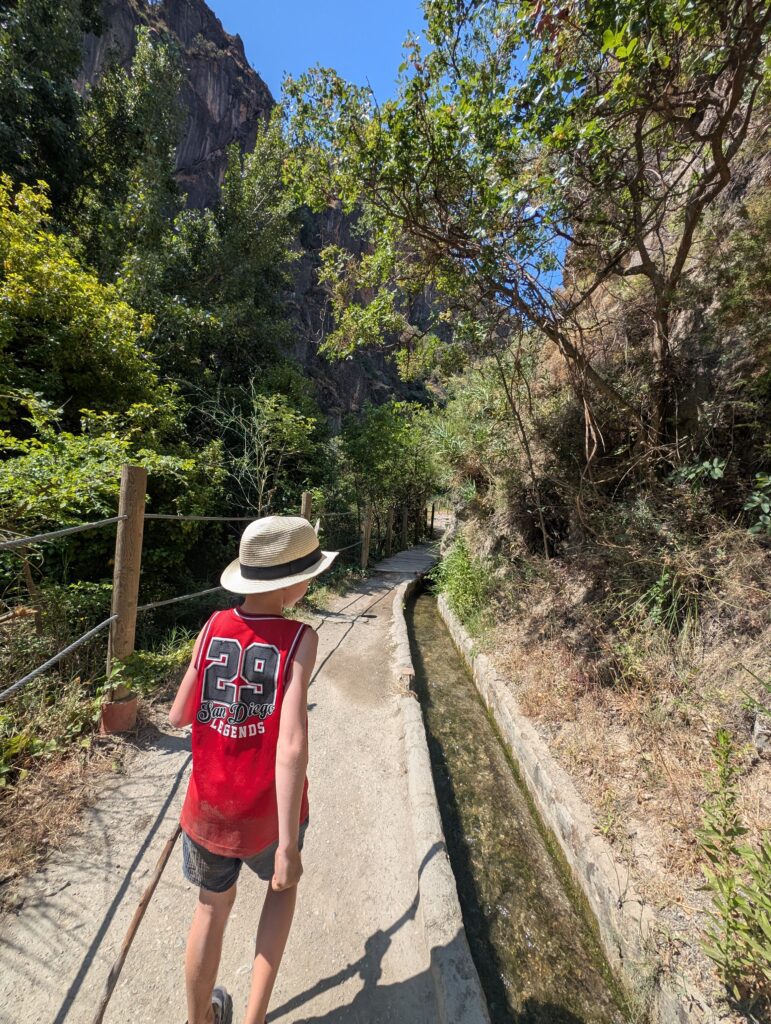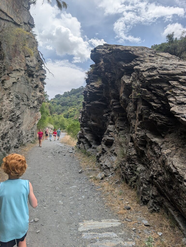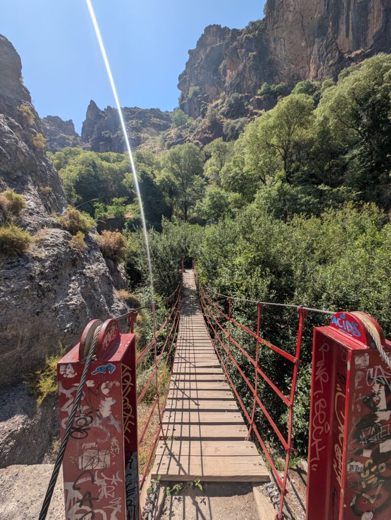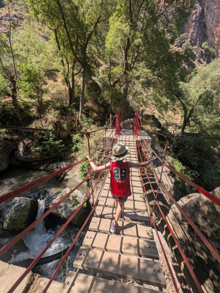 Our favourite family hike was at Los Cahorros in Monachil, where suspension bridges, riverside walks, and caves create a mini adventure park. Kids aged 6+ should manage most of the main trail, though sturdy shoes and a sense of adventure are a must. The landscape is simply beautiful as well – just remember water and snacks are a must!