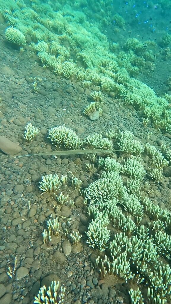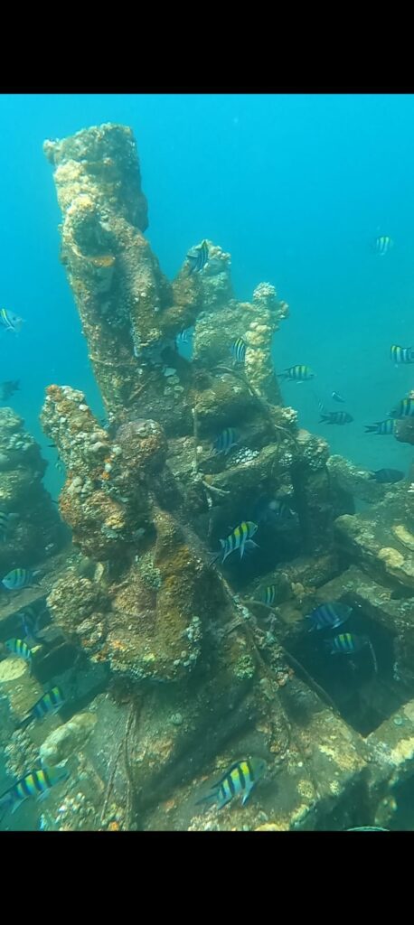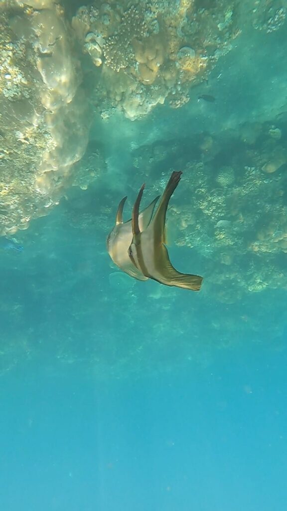If you hire a moped (no Grab/Gojek again) then a 5 minute ride further along the coast brings you to a small bay where the snorkelling is even more amazing as the reef and coral is more prevalent here. The other bonus here is that there is a small hindu temple to be found under the water – this is located around half way along the bay – and it’s not something you see every day!