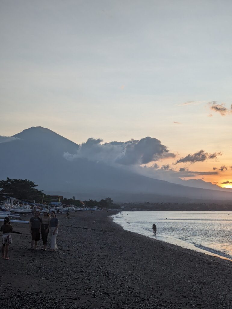 The town has a real diver feel about it with lots of diving centres offering Padi certs or day trips. Our first glimpse of the beach was at sunset and the sun was setting behind the volcano at around 6pm (a bit earlier than other parts of Bali) which gave a very impressive back drop.